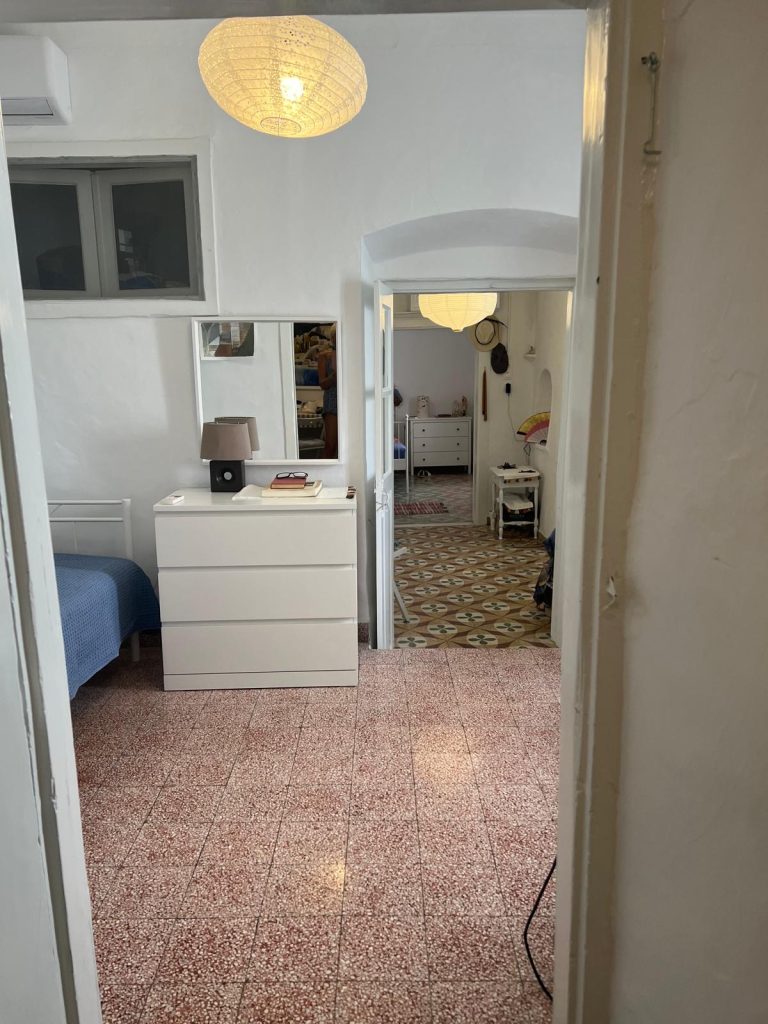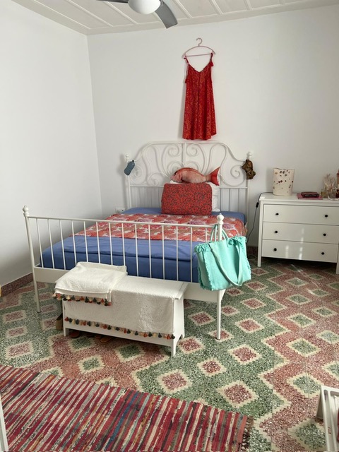 The house is 125sqm and the yard about 150 including the outside bathroom, a great advantage as it is private. It is in a lovely quiet area. On the lower level is a large bedroom, a lounge area used as another bedroom, dining room and kitchen that leads out to the yard and bathroom. On the upper level are two bedrooms and a balcony.