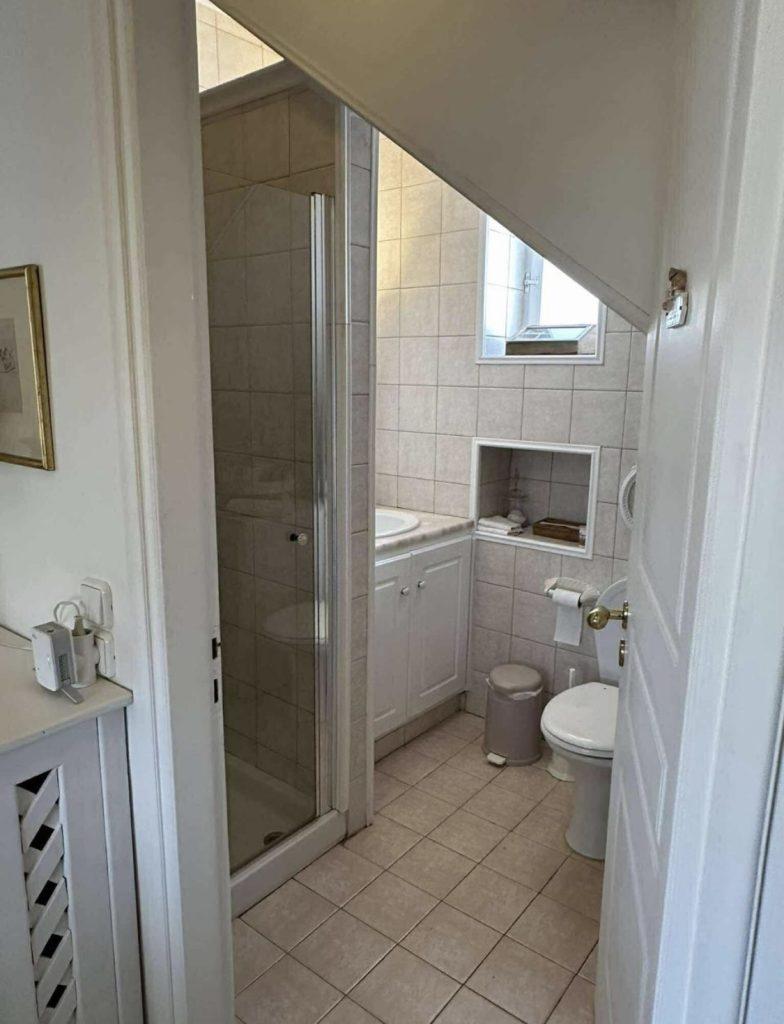 There is a bathroom in the hallway from the kitchen. On the other side of the hallway is a double bedroom.