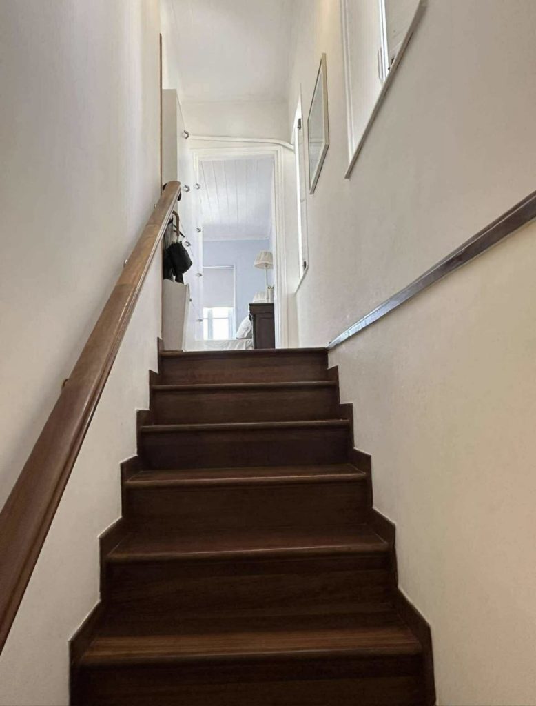 A wooden staircase leads up to the first floor. A beautifully decorated master bedroom which then has a walk in wardrobe before the en-suite bathroom